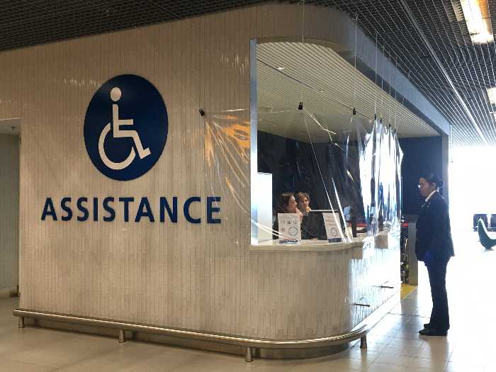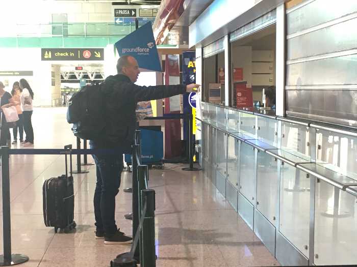 (左)3/24 ポルトガル、リスボンの空港案内所。客がカウンターから2m離れるようにテープがカウンターと平行に張ってあります。