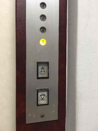 (右)4/10 日本のマンションや雑居ビルのエレベーター操作盤。ここも不特定多数の人が触れます。各自アイデアを出して素手で触れないように気をつけましょう。