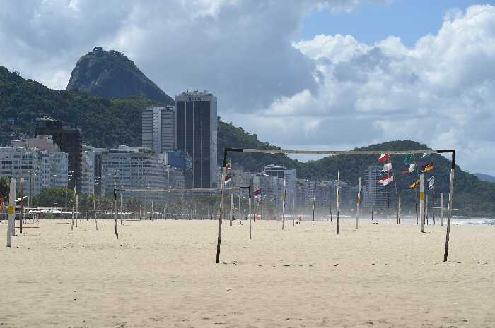 (左)3/23 有名なコパカバーナビーチ。普段、ビーチサッカーを楽しむ人で賑やかな浜辺には誰もいません。