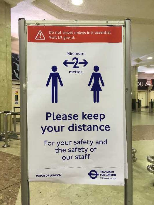 (左)3/27 ロンドン・ヒースロー空港地下鉄駅では、『他の人と最低2m保ってください』と掲示された看板が出ていました。