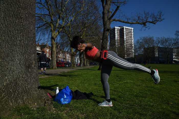 (右)3/25 ロンドン西部の公園。一人でエクササイズする女性。