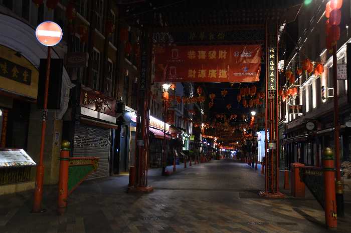 (右)3/25 ロンドン中心部の中華街、チャイナタウン。奥に見えるのは有名なミュージカルの劇場街、その周りも外出自粛でゴーストタウン化しています。