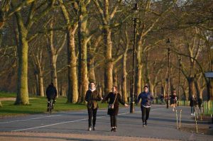 (左)3/27 ロンドンのハイド・パーク。個人や家族での運動は 奨励されていたので、ジョギング・散歩する人達。