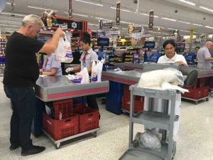 (右)3/20 ブラジル、マリンガのスーパーマーケット。薬局とスーパー以外の閉店が決まった3/20(金)からスーパーのレジ係は感染予防のため手袋を着用。