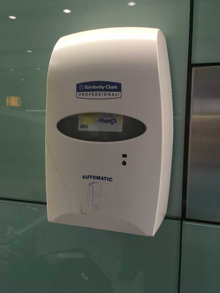 (左)3/24 ロンドン・ヒースロー空港のアルコール消毒液。不特定多数の人がスイッチに触って感染しないように手を近づけるだけでセンサーによって噴射される仕組み。