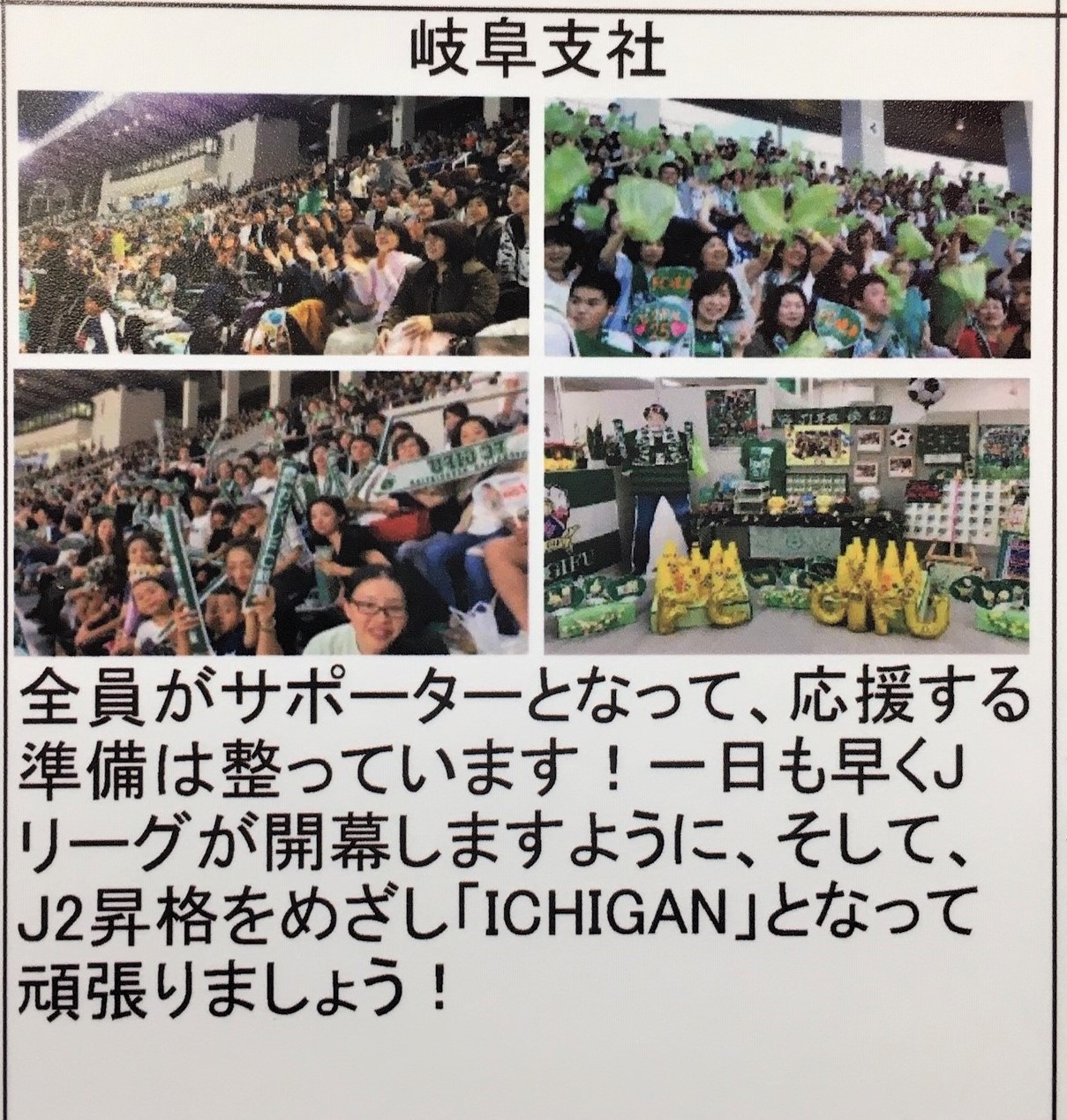 明治安田生命 岐阜支社の皆様からもFC岐阜に対し「全員がサポーターとなって、応援する準備は整っています!一日も早くJリーグが開幕しますように、そして、J2昇格をめざし「ICHIGAN」となって頑張りましょう!」と熱いメッセージを頂きました。