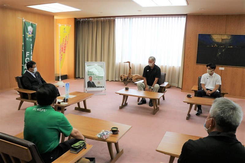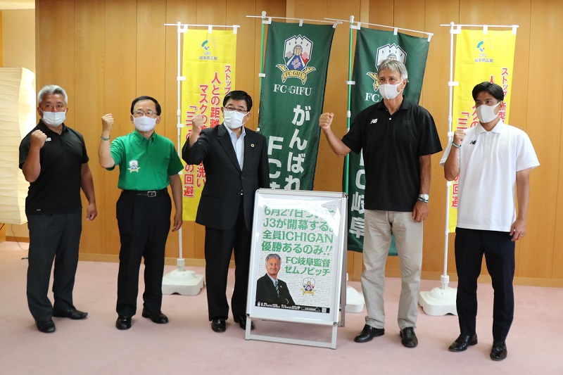 6月27日(土)の2020シーズン開幕戦を目前に控え、6月24日(水)岐阜県庁にて、ゼムノビッチ ズドラブコ 監督、宮田 博之 社長、木村 哲昌 チーム統括本部長、竹田 忠嗣 選手が、古田 肇 岐阜県知事を表敬訪問させていただきました。