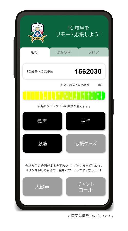 また、スタジアムで今まさに繰り広げられているプレーに応じて、現地から参加者に合図を送ることで、連動した特定の「シーンボタン」が点滅します。そのボタンを押すことで、リアルタイムの試合展開に合わせたタイムリーな声援を送ることが出来ます。