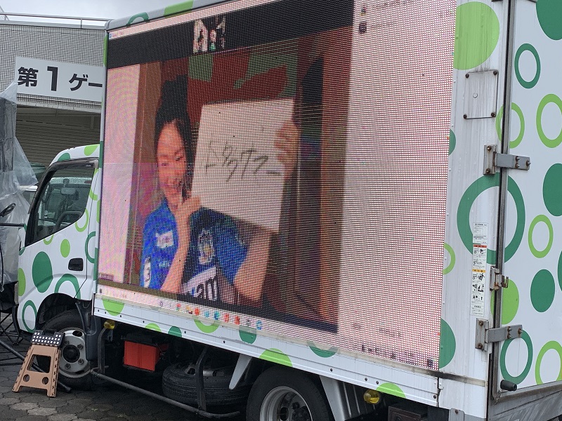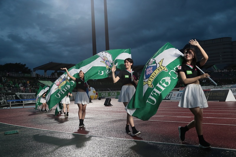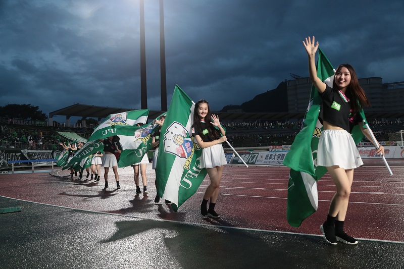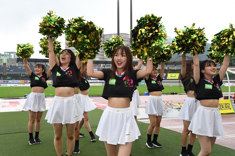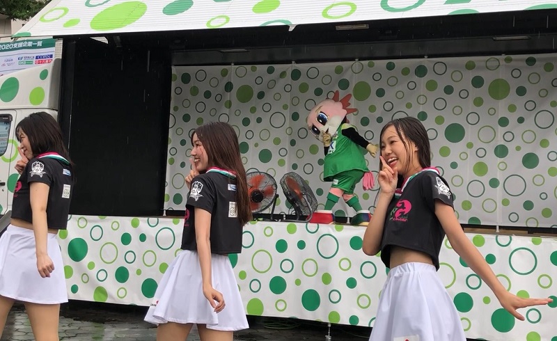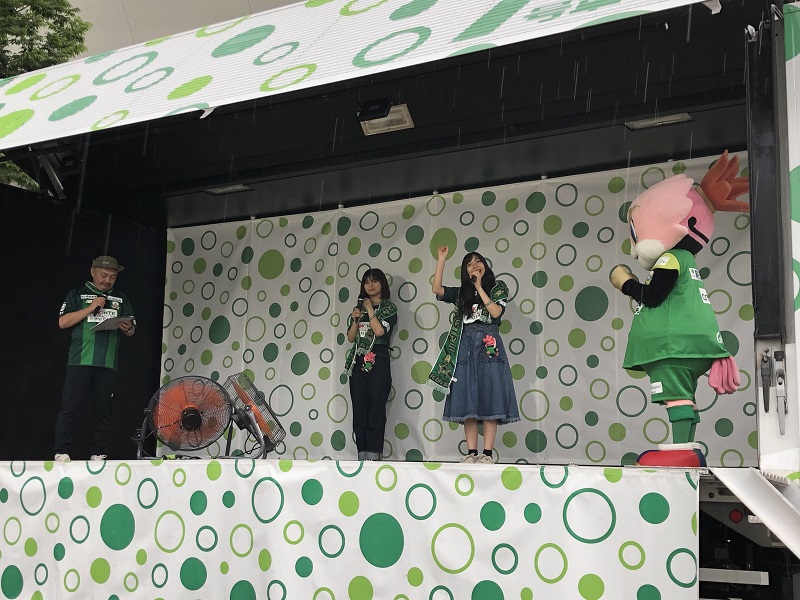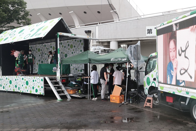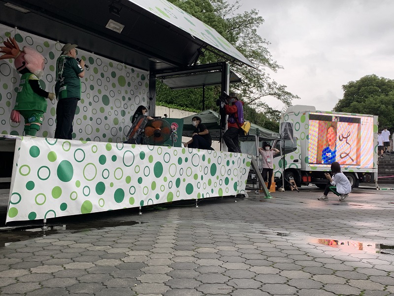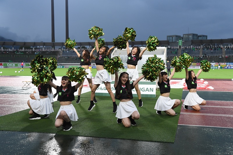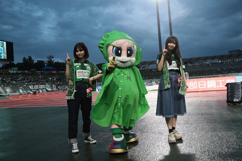 ときおり激しく雨が降る中でしたが、ステージでのトークや試合前パフォーマンス、ハーフタイムでのダンスとキャラバンなど、華やかで元気いっぱいのパフォーマンスを見せてくれました。