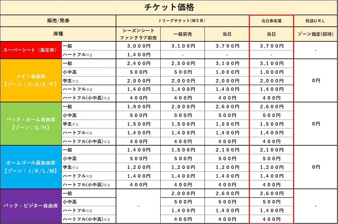 ※Jリーグチケット(WEB)でのチケット購入では、購入方法により「手数料」が発生する可能性がございます。購入方法によっては「当日券売場」で購入するよりお値段が高くなる可能性がありますので、予めご了承ください。