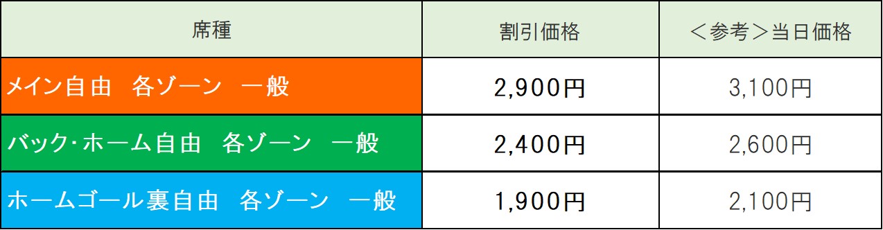 ※2:障がい者手帳等をお持ちの方、高齢者(試合日時点で65歳以上の方)の特別優待割引サービスです。当日券売場でチケットを購入する際と入場する際に"障がい者手帳等"、高齢者の方は"生年月日の公的証明書類(運転免許証等)"のご呈示をお願いいたします。