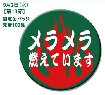 正しくは添付画像の「メラメラ燃えています」の缶バッジになります。