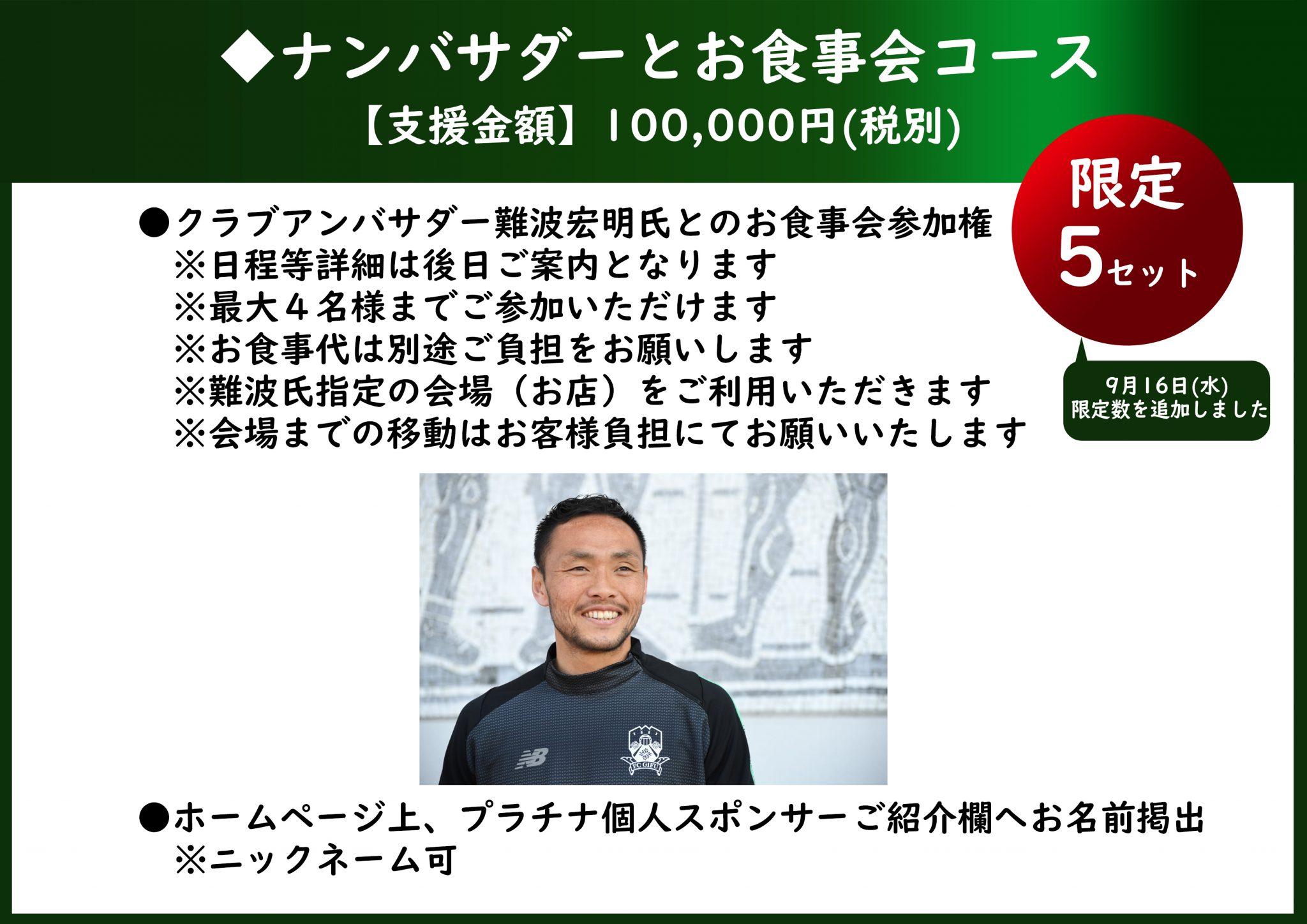 既にお申し込みが限定セット数に達しておりましたが、お申し込み者様と難波クラブアンバサダーのご厚意により、限定数を追加して募集を開始させていただきます。◆ナンバサダーとお食事会コース お申し込みはこちら(受付を終了いたしました)