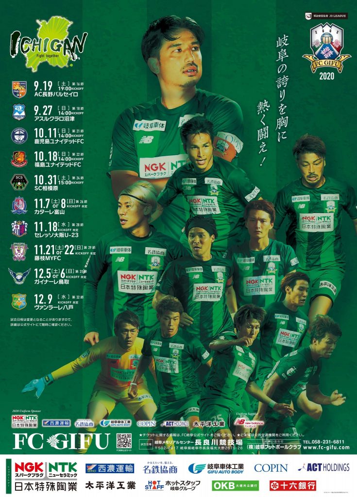 標記の件、『2020シーズン後半戦ポスター』、『岐阜市民総力戦ポスター』につきまして、本日よりFC岐阜事務所にて配布を開始いたします。