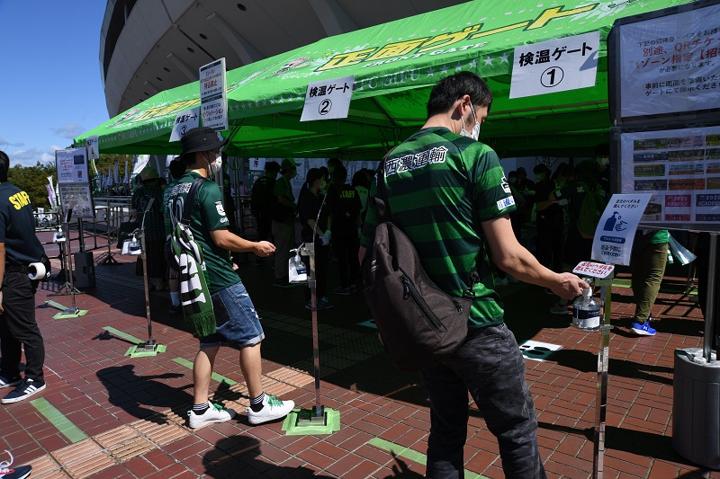 入場ゲートでの手指消毒と検温、社会的距離を保った待機列に、ステージイベントや試合の観戦時は前後左右1m以上空けての配置となっております。