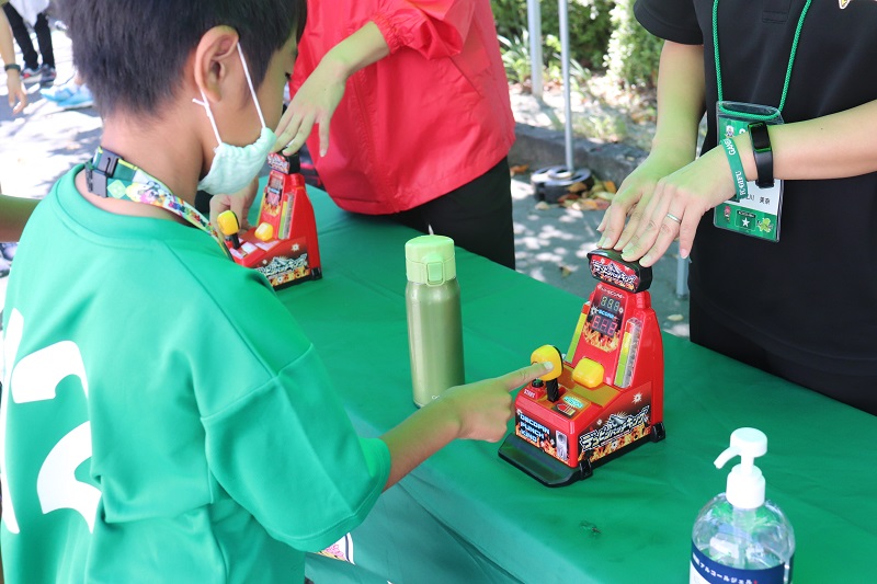 「デコピンの強さこそが漢の証」ということでデコピンマシンを設置。目標スコアを越えた方にはギッフィーステッカーをプレゼントしました。