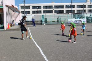 初めてのサッカー教室にみんな最初は緊張していましたが、コーチの話をよく聞いて一生懸命ボールを蹴っている姿が印象的でした。