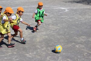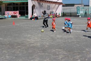サッカー教室は12日に年長、14日に年中・年少の園児に分かれて実施しました。
