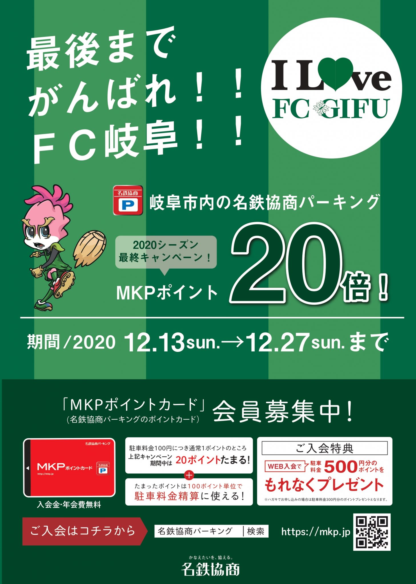 トップパートナーである名鉄協商株式会社様が、FC岐阜の応援として岐阜市内すべての名鉄協商パーキング(一部ポイントカード使用できない駐車場除く)で、本年最後のポイント20倍キャンペーンを実施していただけることとなりましたので知らせいたします。