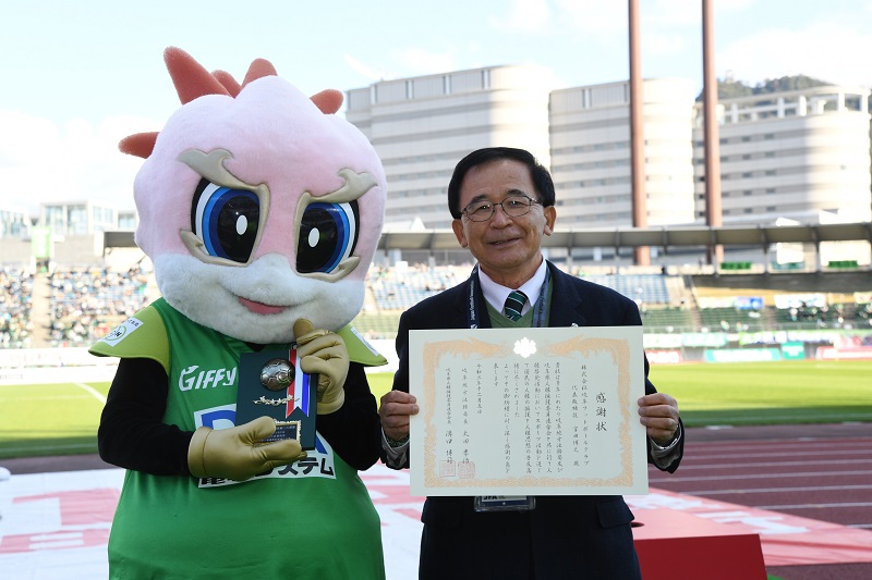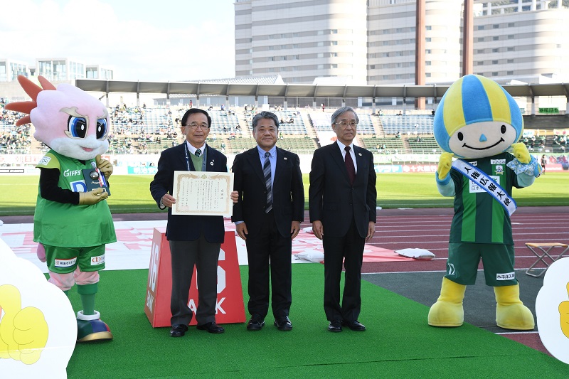 12月5日(土)ガイナーレ鳥取戦の試合前に、FC岐阜のこれまでの活動に対し、岐阜地方法務局長 太田 孝治 様・岐阜県人権擁護委員連合会長 溝口 博司 様より、感謝状と盾を贈呈いただきました。