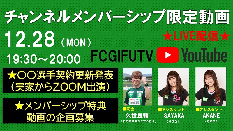12月28日(月)19:15頃にFC岐阜公式YouTubeチャンネル「FCGIFUTV」のコミュニティタブにて配信URLをメンバー限定にお送りします。