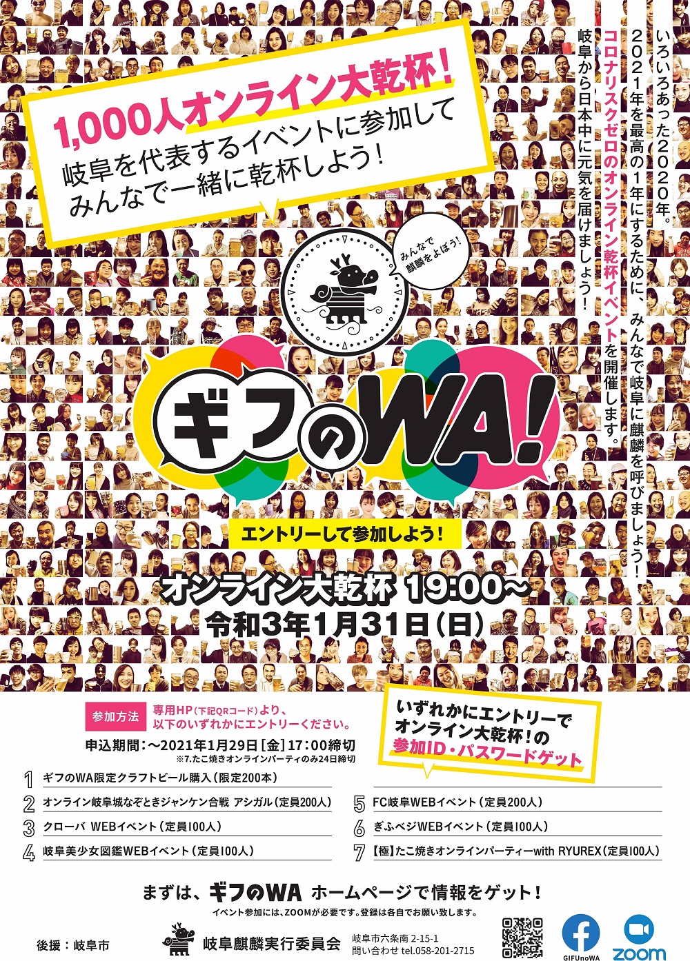 1月31日(日)に岐阜麒麟実行委員会主催によるオンラインイベント1,000人オンライン大乾杯「ギフのWA!」が開催されます。このオンラインイベントは、コロナ禍に負けず、2021年の岐阜をいろいろな団体と盛り上げていこうというイベントです。FC岐阜では昨年開催できなかった「難波アンバサダーの2021シーズン展望」を開催します!