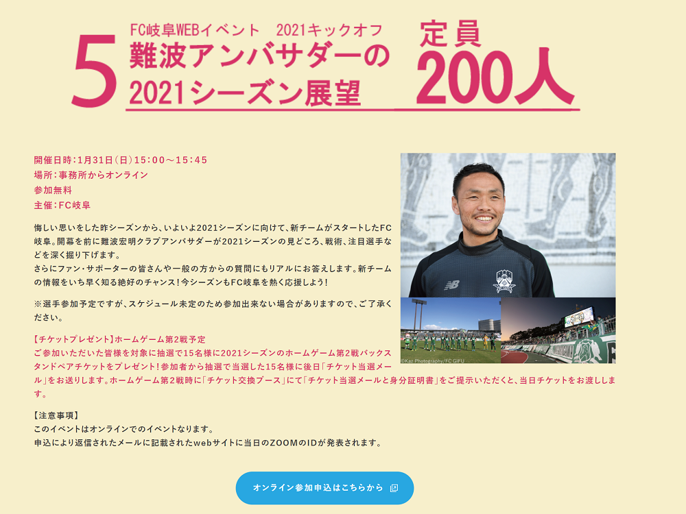 【更新】1/31(日)オンラインイベント「ギフのWA!」FC岐阜イベント「2021難波アンバサダーシーズン展望」開催のお知らせ