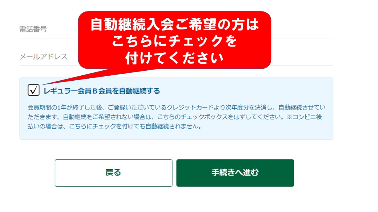 自動継続入会を希望される場合は、お申し込みの際に、会員情報登録ページの「自動継続する」のチェックボックスにチェックをつけてください。