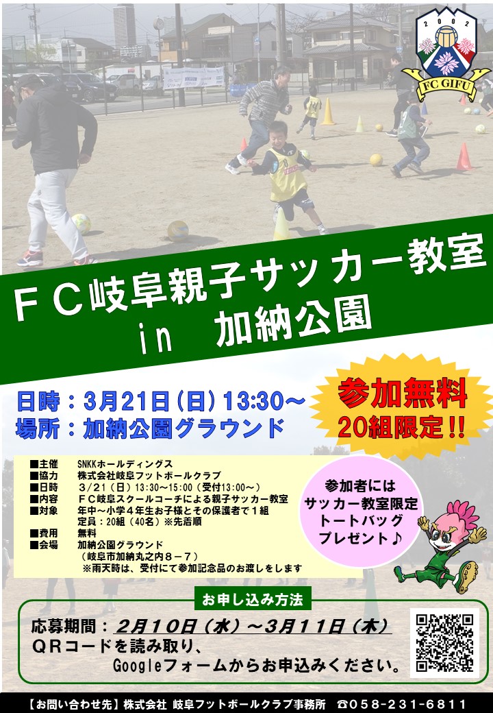 3月21日(日)岐阜市の加納公園グラウンドにて、「FC岐阜親子サッカー教室in加納公園」を開催いたします。