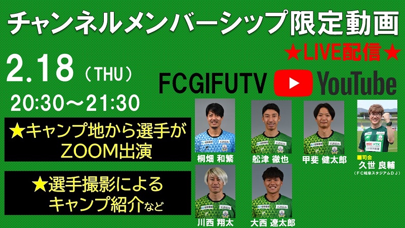2月18日(木)20:00頃にFC岐阜公式YouTubeチャンネル「FCGIFUTV」のコミュニティタブにて配信URLをメンバー限定にお送りします。