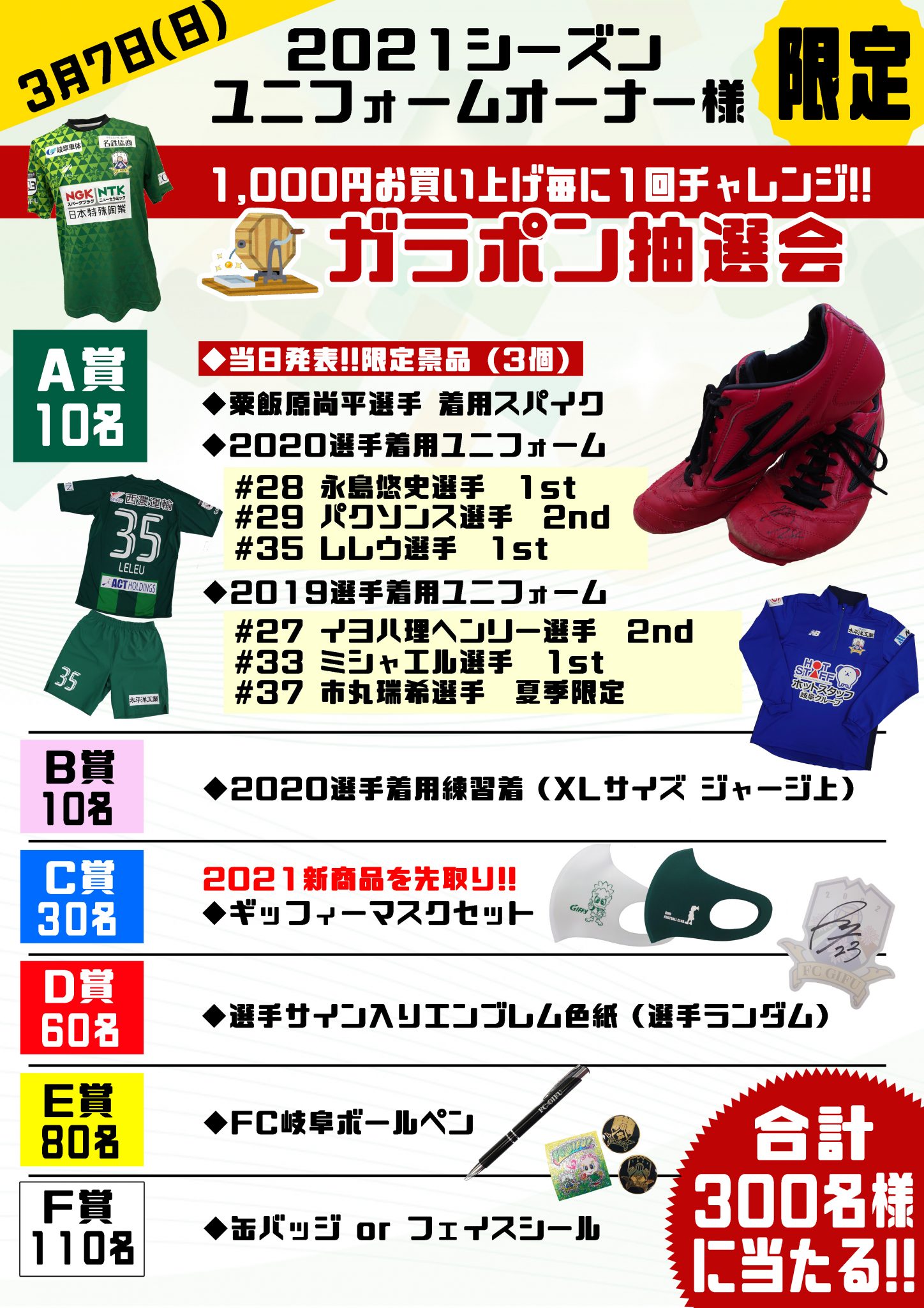 3月6日(土)・7日(日)の二日間、「ギッフィーのおうち」でグッズをお買い求めの2021シーズンユニフォームオーナー様を対象に、豪華景品が当たるガラポン抽選会を開催いたします!