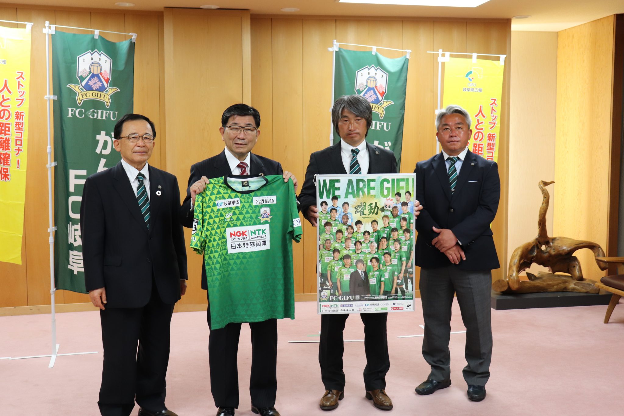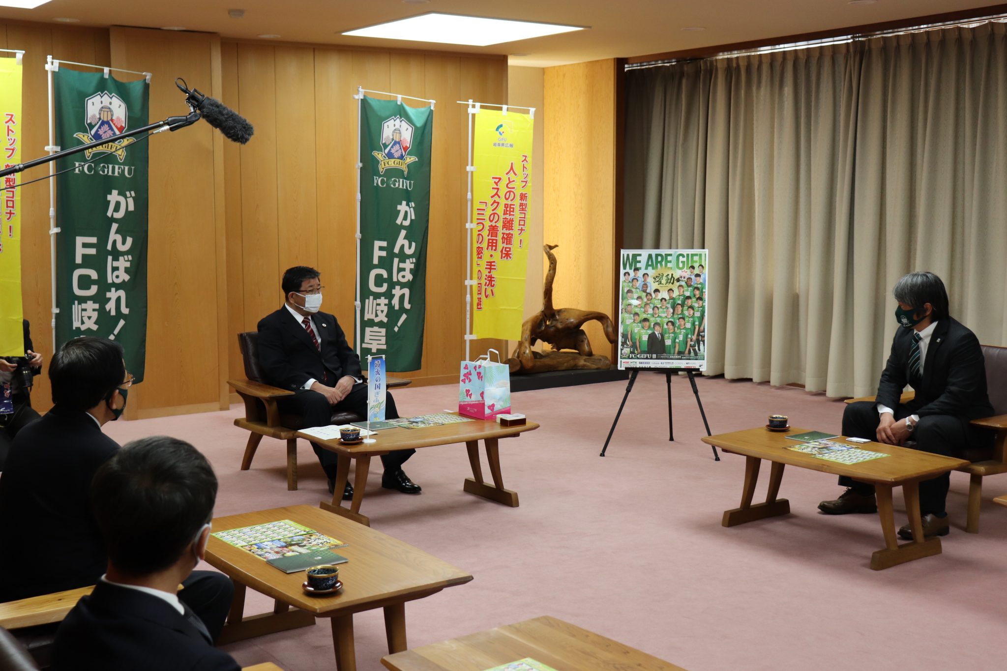 古田知事からも「昨シーズンはコロナ禍でも非常に多くのサポーターが声援に駆けつけてくれた。FC岐阜には今シーズンこそJ2昇格を成し遂げてほしい。コロナ対策に気を付けつつ、頑張っていただきたい」と激励をいただきました。