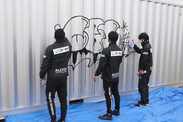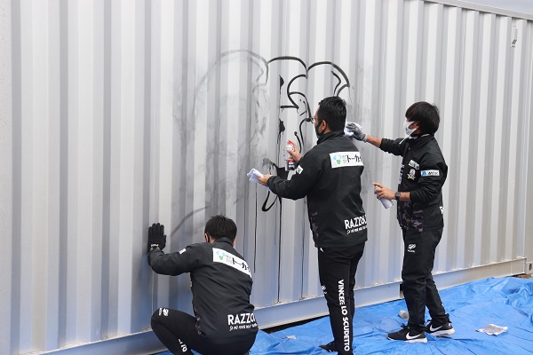本日(3月4日)行われました岐阜県サッカー協会が実施するコンテナの落書き消しに、FC岐阜からアカデミーコーチ6名も参加させていただき、笠松町役場の方と共に落書き消しを実施いたしました。