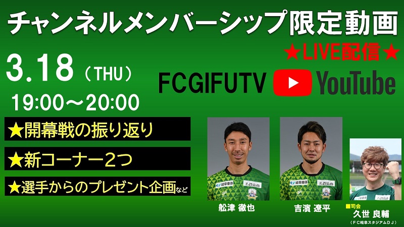 3月18日(木)18:30頃にFC岐阜公式YouTubeチャンネル「FCGIFUTV」のコミュニティタブにて配信URLをメンバー限定にお送りします。
