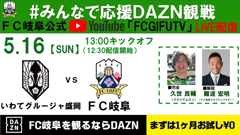 5月16日(日)明治安田生命J3リーグ第8節、アウェイでのいわてグルージャ盛岡戦は「#みんなで応援DAZN観戦」として、FC岐阜公式YouTubeにてDAZNと一緒に見ながら楽しめる内容となっておりますのでぜひご覧ください。