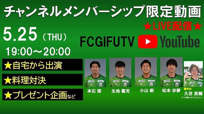 5月25日(火)18:30頃にFC岐阜公式YouTubeチャンネル「FCGIFUTV」のコミュニティタブにて配信URLをメンバー限定にお送りします。