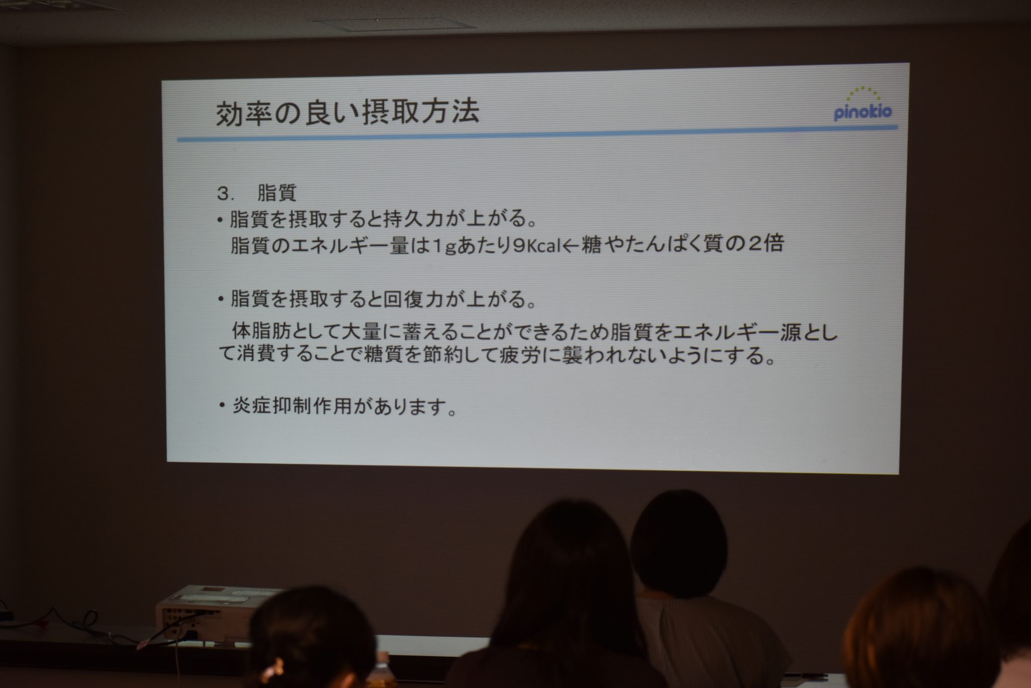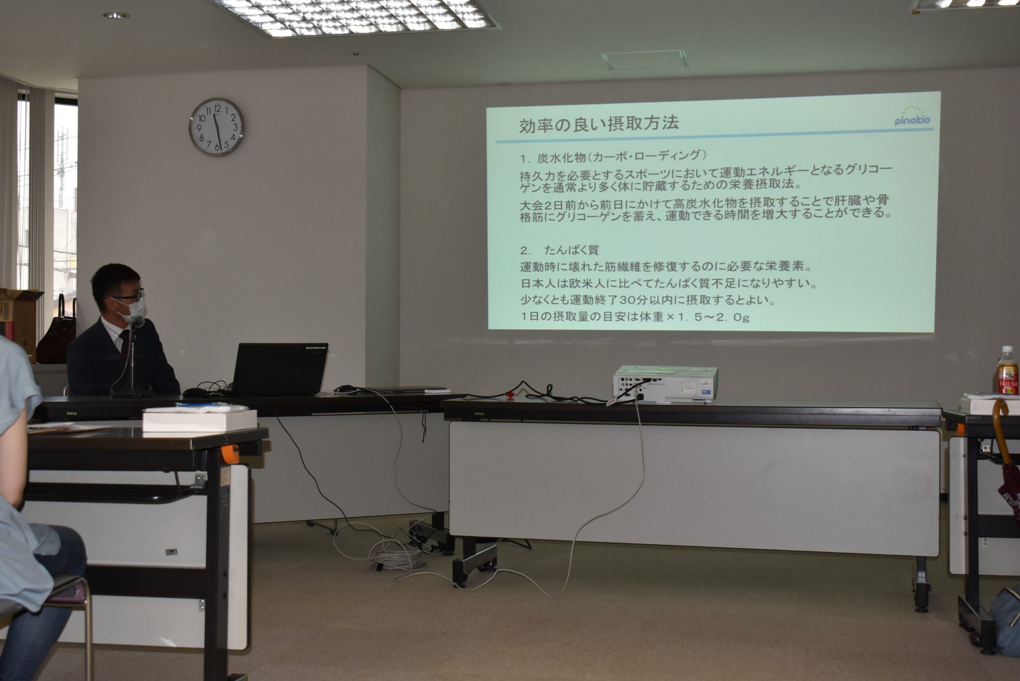 ピノキオ薬局の市村執行役員からは、スポーツ選手をするうえで心掛けたい「栄養素の効率のいい取り方」「スポーツに大事な栄養素」についてお話いただきました。