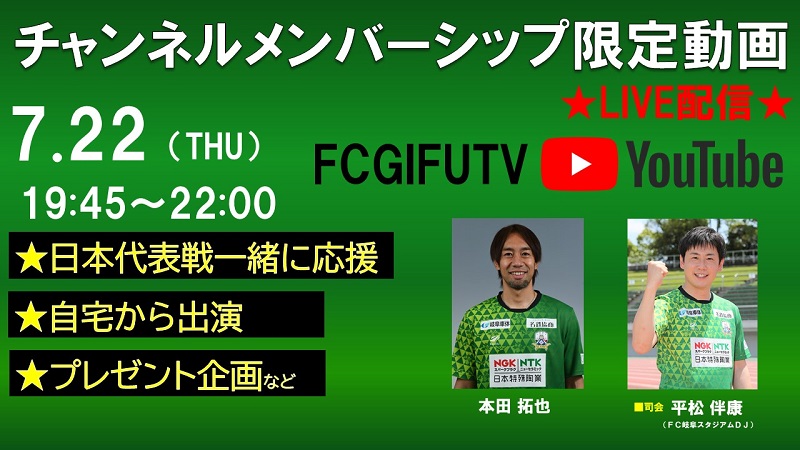 7月22日(祝・木)19:00頃にFC岐阜公式YouTubeチャンネル「FCGIFUTV」のコミュニティタブにて配信URLをメンバー限定にお送りします。