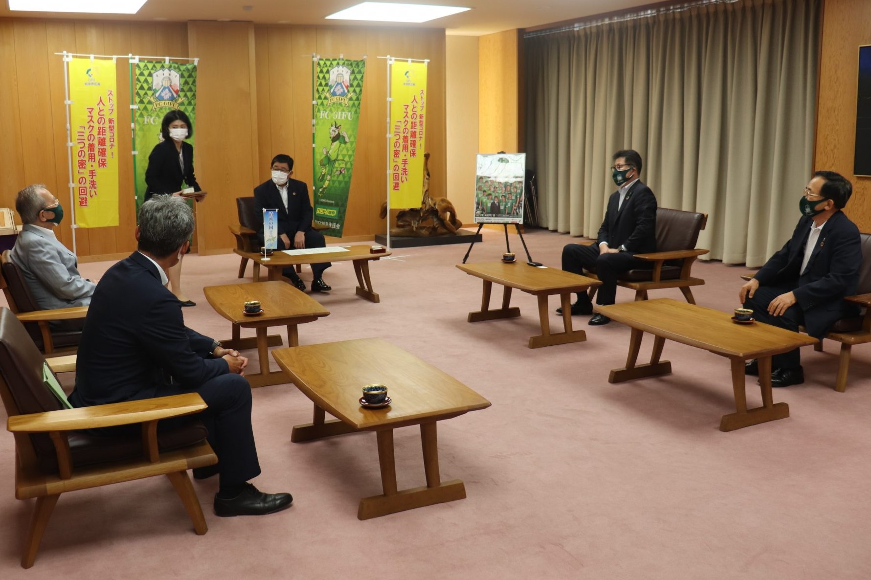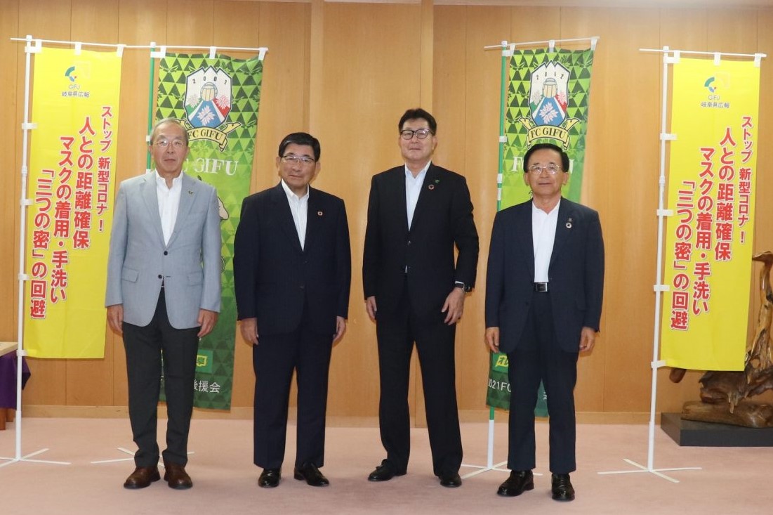 FC岐阜後援会の役員改選を受け、7月14日(火)岐阜県庁にて、櫻井 宏 会長、岸野 吉晃 相談役(前会長)、宮田 博之 社長がFC岐阜後援会名誉会長の古田 肇 岐阜県知事を表敬訪問いたしました。