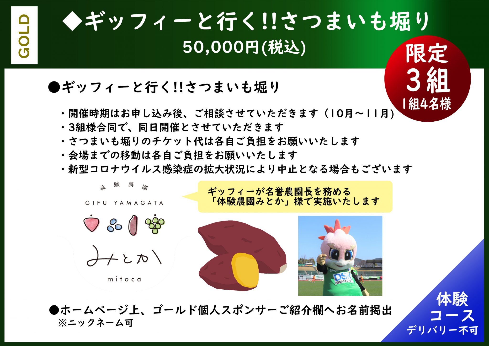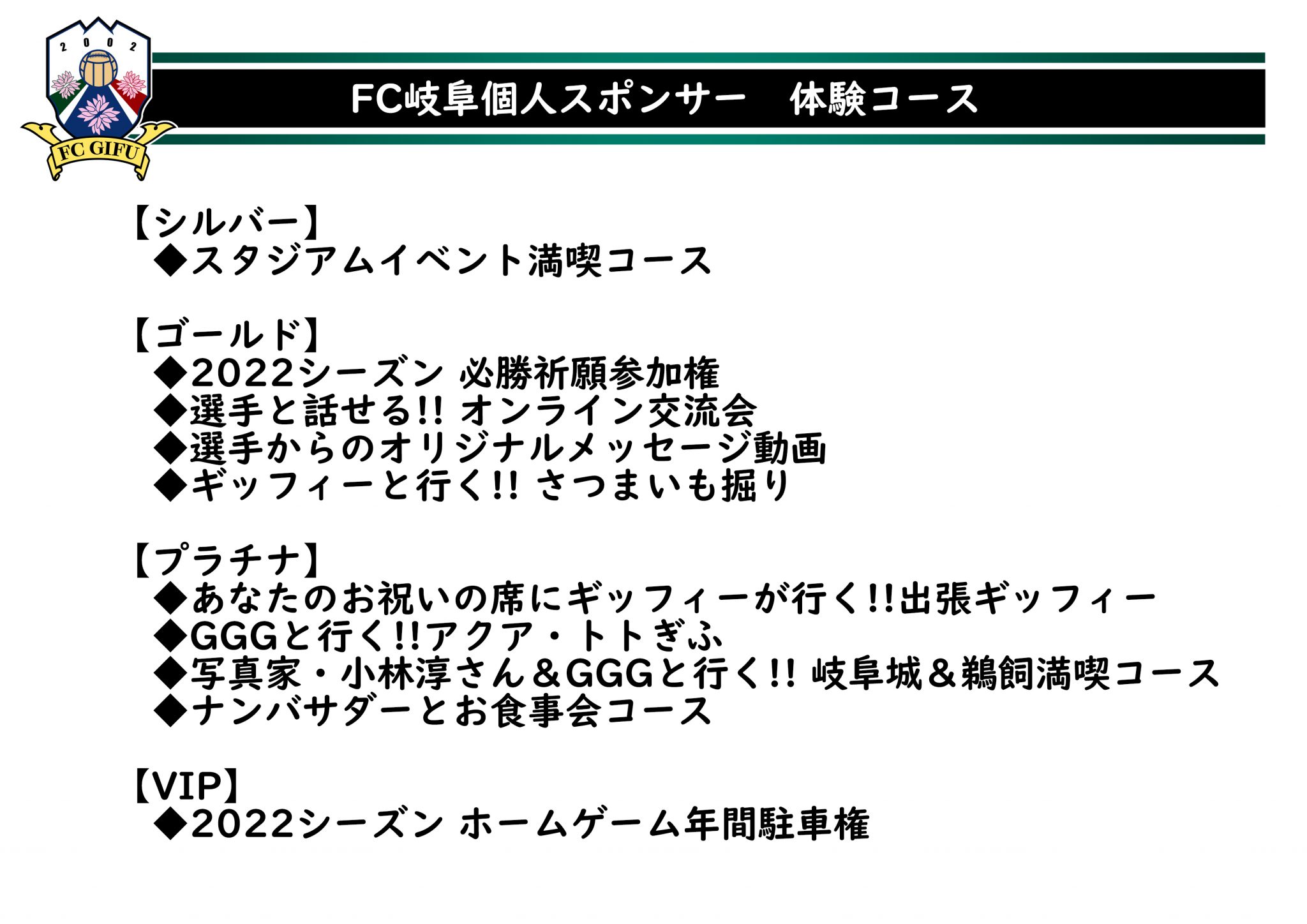 今年度は「個人スポンサーSeason2」として、「特別な商品、特別な体験を!」をテーマに、普段なかなか手に入らない特別な商品や、選手・難波クラブアンバサダー・ギッフィー・GGGとの触れ合いが出来る特別な体験など、昨年以上に楽しいFC岐阜独自の企画内容で実施させていただきます。