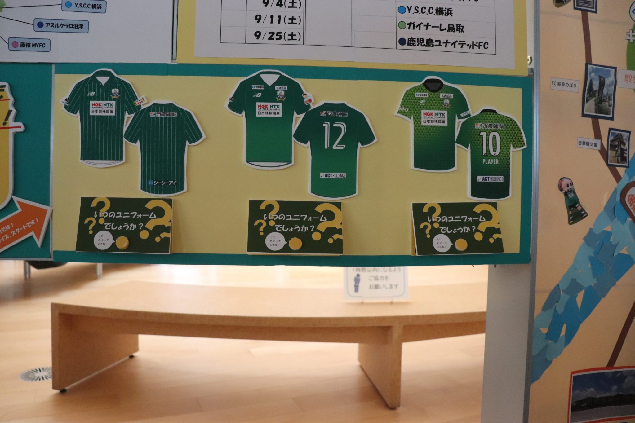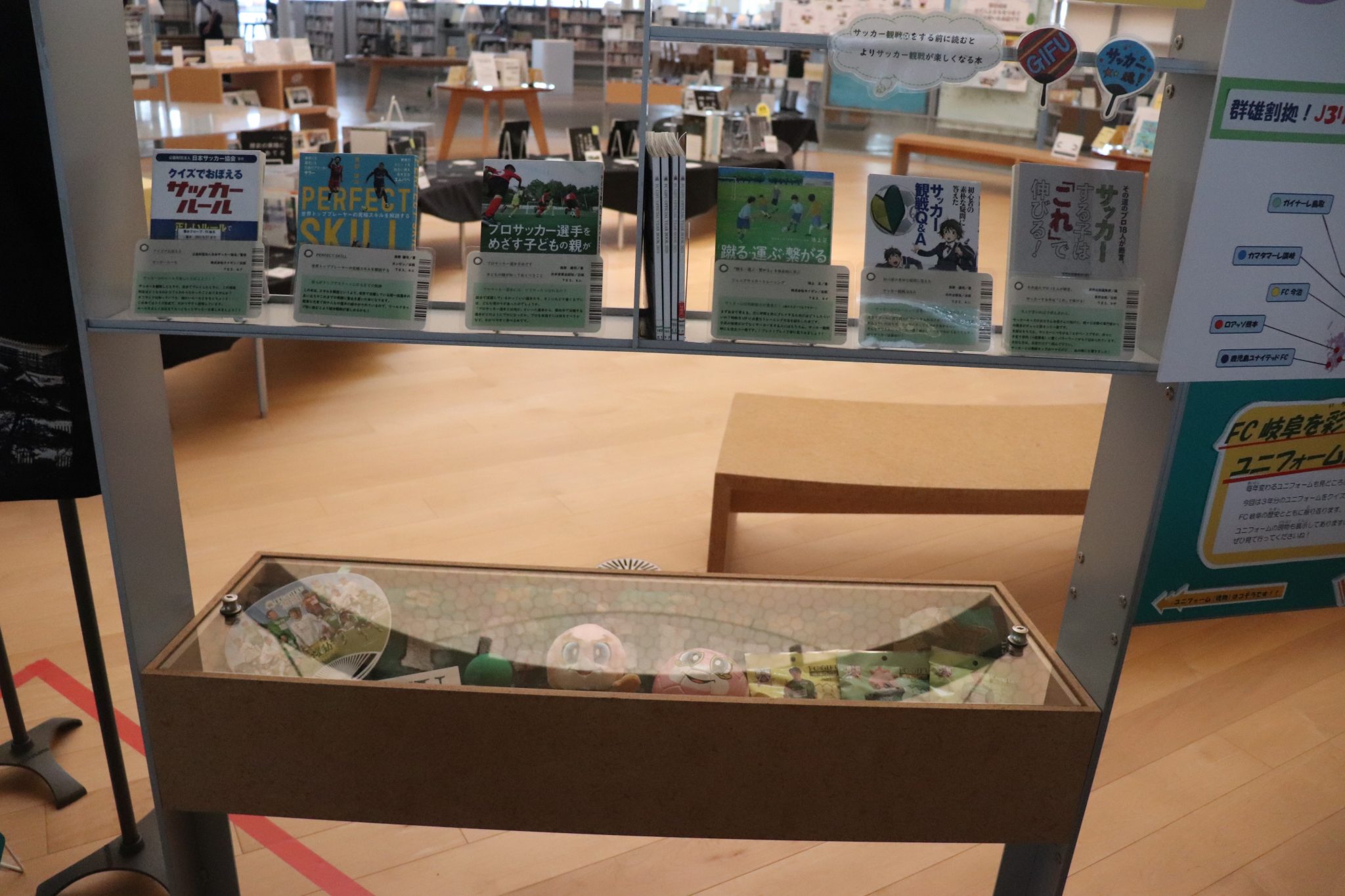JリーグやFC岐阜を紹介する展示や2021シーズンの1stユニフォーム、リミテッドユニフォームなどのグッズ展示のほかサッカーに関する本の紹介
