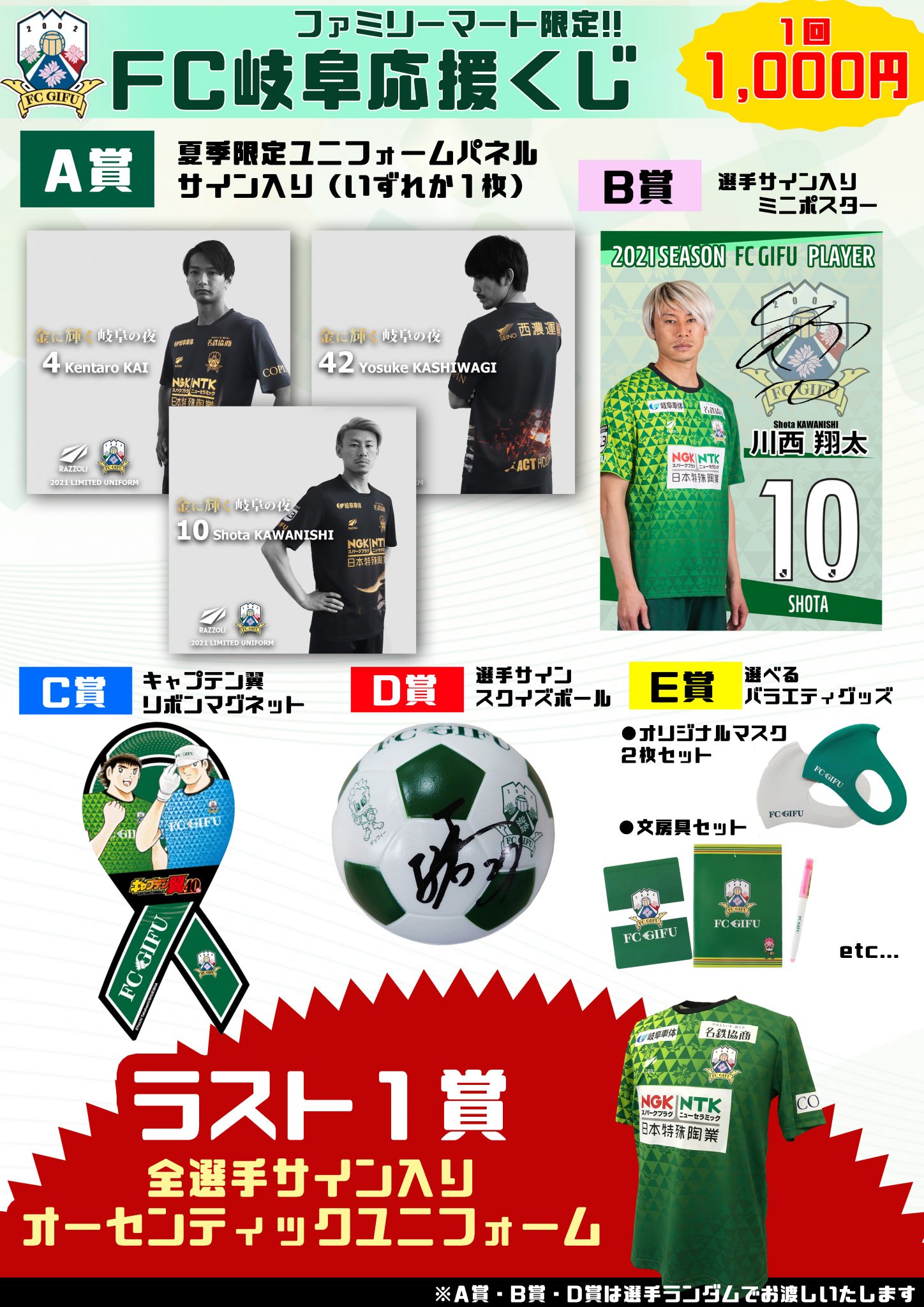 日頃よりFC岐阜を応援いただいているファミリーマートの対象店舗限定で、選手のサイン入りグッズなどの豪華景品が当たる「FC岐阜応援くじ」を8月28日(土)より実施いたします。