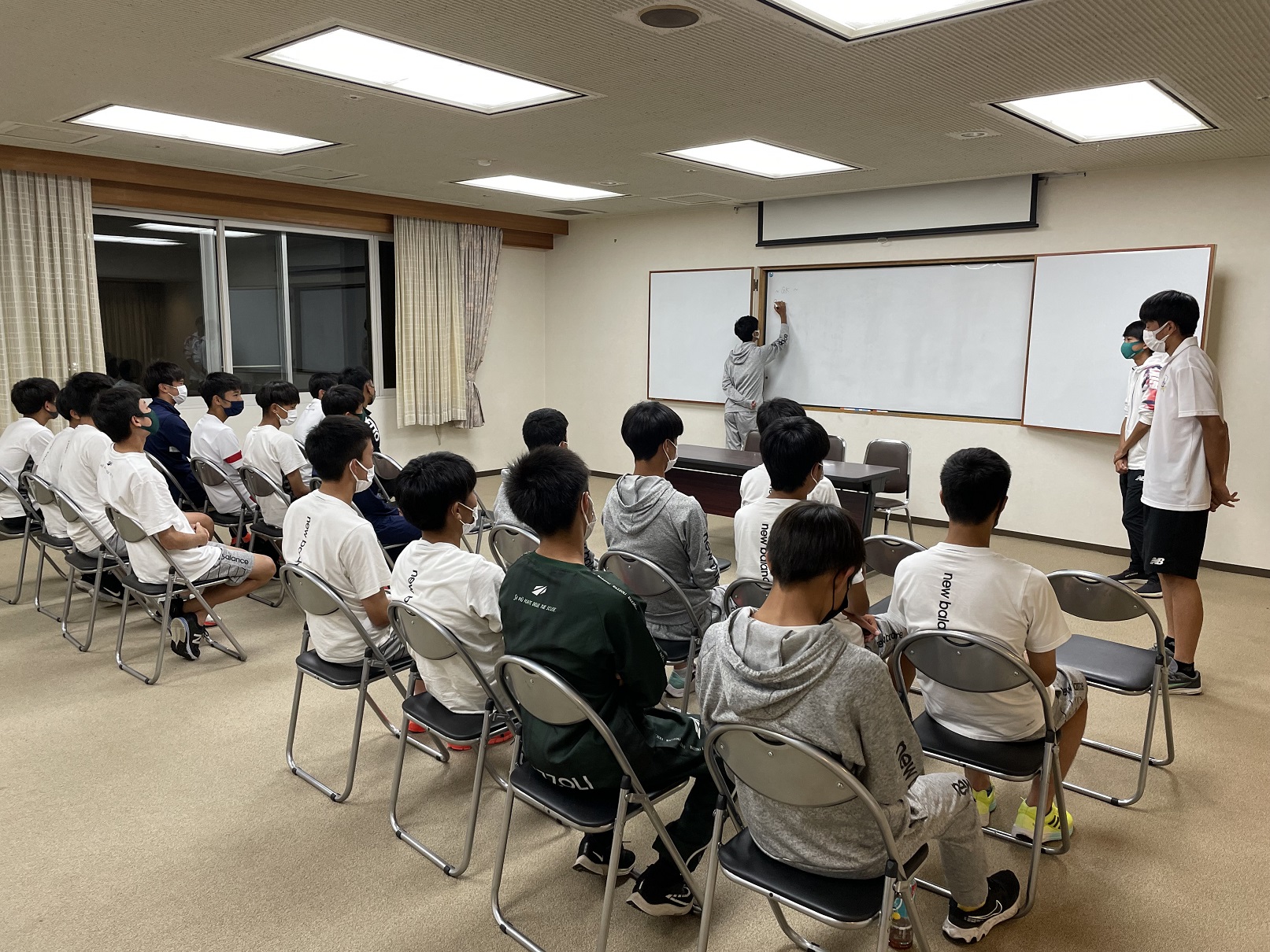 夕食の後は今日もミーティングを開催。今回はポジション毎に分かれ、それぞれに今日の試合の反省点や良かった点を話し合い。代表者が発表して全員で内容を共有していきます。