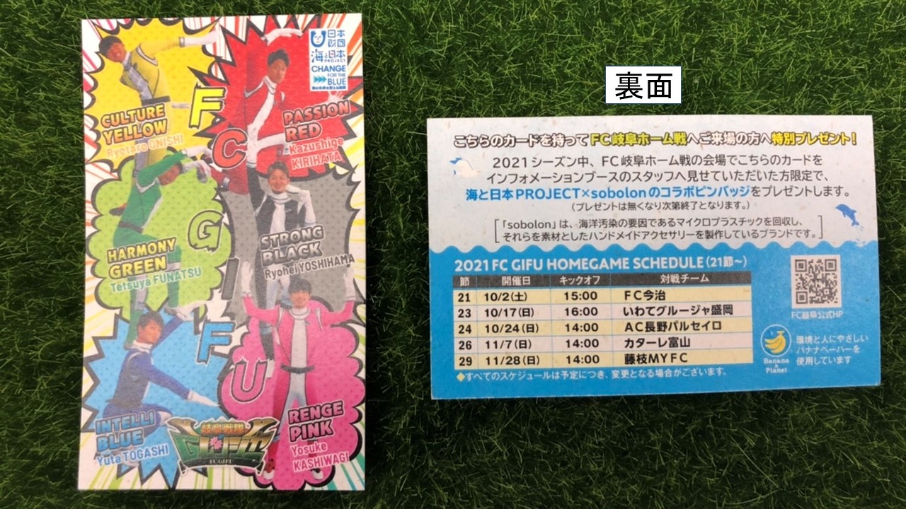 さらに、10月30日(土)に開催予定の「ぎふチャンパーソナリティとごみを拾おう!~海なし県から海洋ごみをなくすため、私たちにできること~」に参加いただき、上記のカードを提示いただくと海と日本PROJECT実行委員会とコラボした岐阜戦隊Gレンジャーカード(イラストVer.)をプレゼントします。