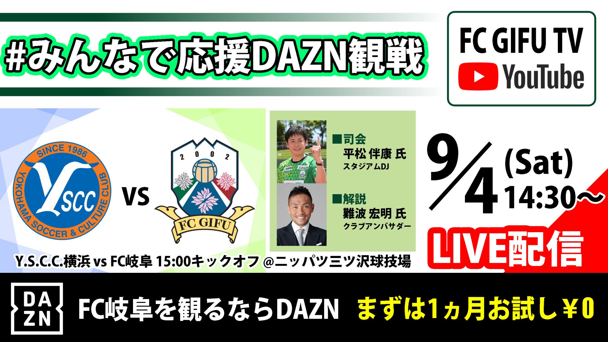 9月4日(土)明治安田生命J3リーグ第17節、アウェイでのY.S.C.C.横浜戦は「#みんなで応援DAZN観戦」として、FC岐阜公式YouTubeにてDAZNと一緒に見ながら楽しめる内容となっておりますのでぜひご覧ください。