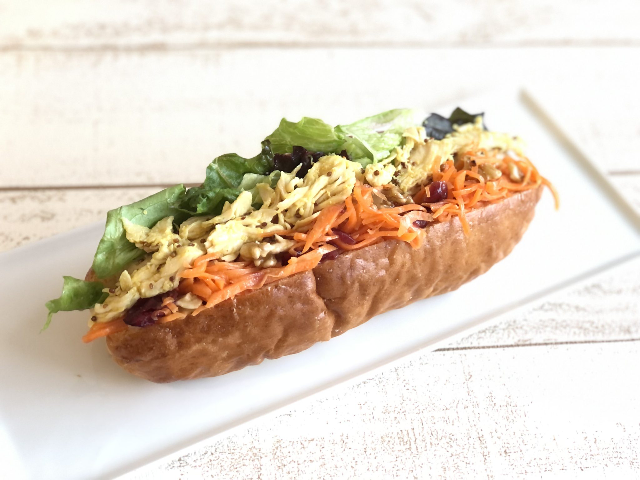 レンゲの蜂蜜を使ったハニーマスタードチキンとキャロットラペを挟んでいます。