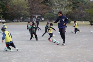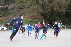 低学年のカテゴリーでは、ボールに触れる楽しさやサッカーのおもしろさを感じられるメニューを実施し、選手との競争などもあり、選手二人も楽しく参加していました。