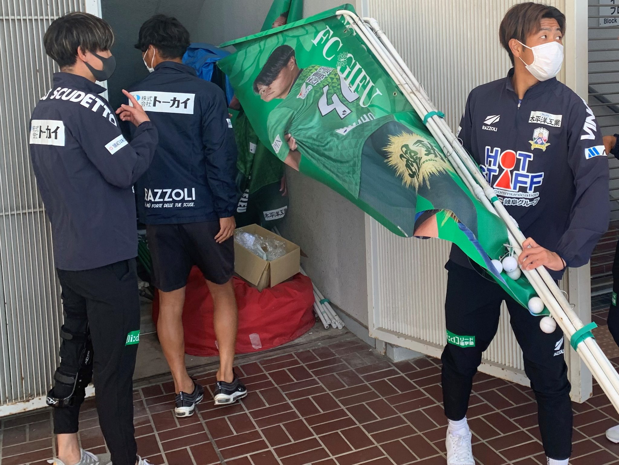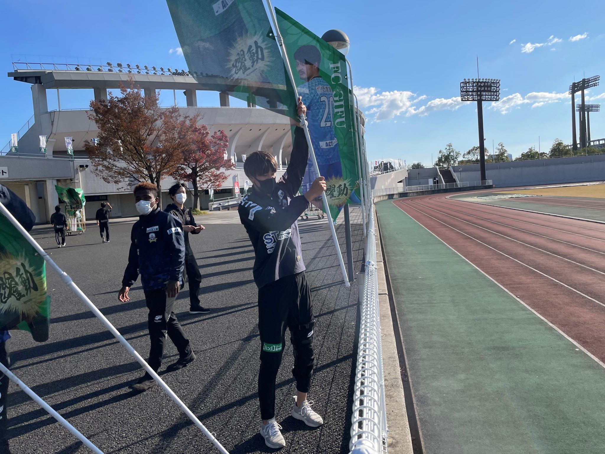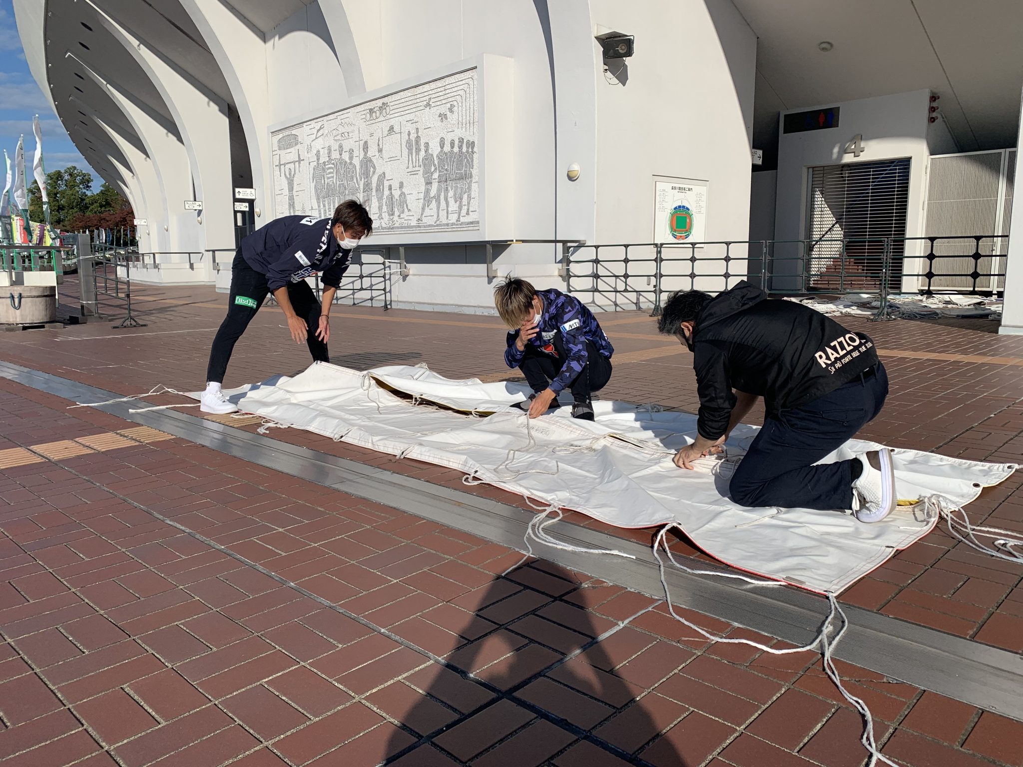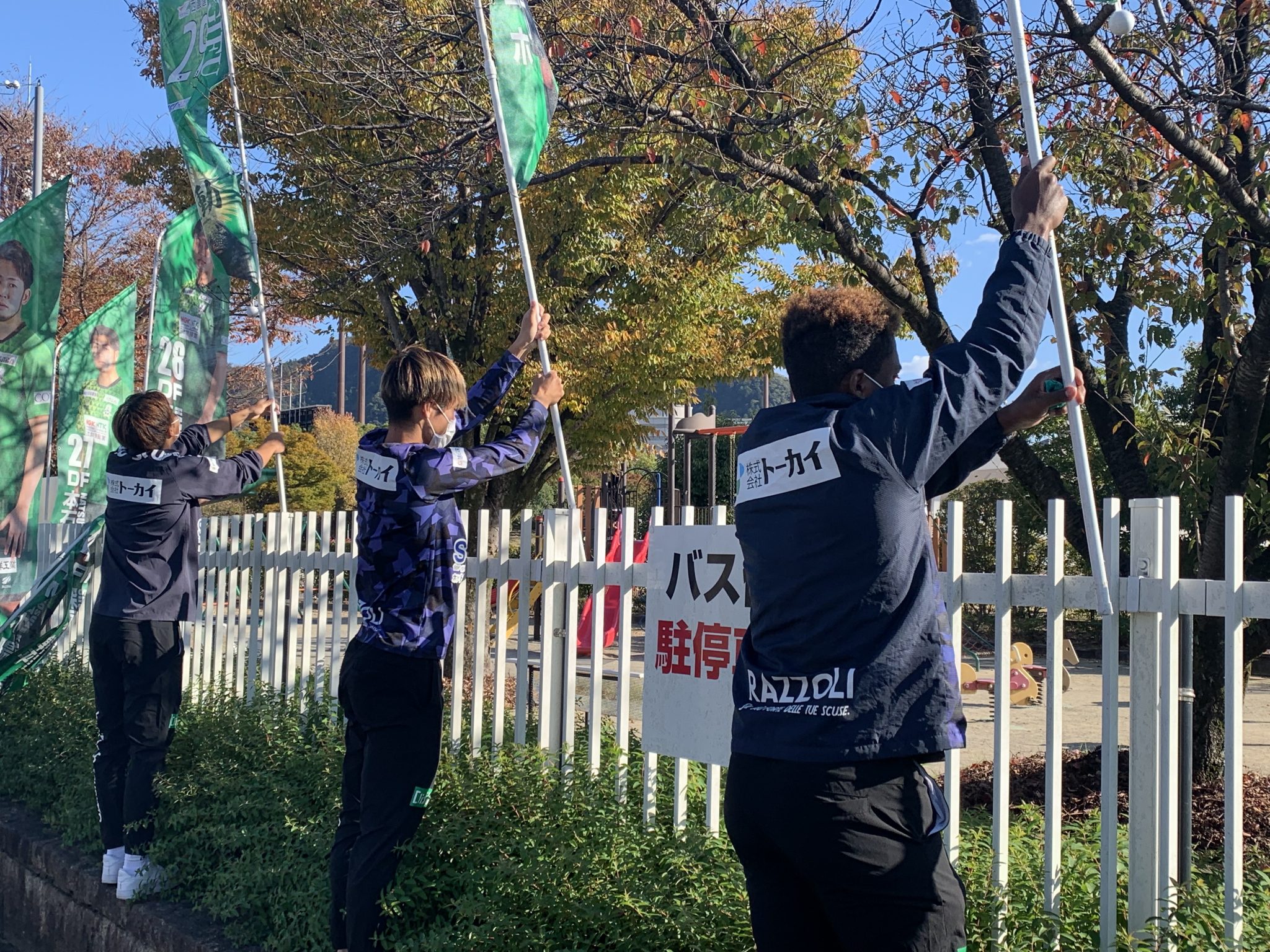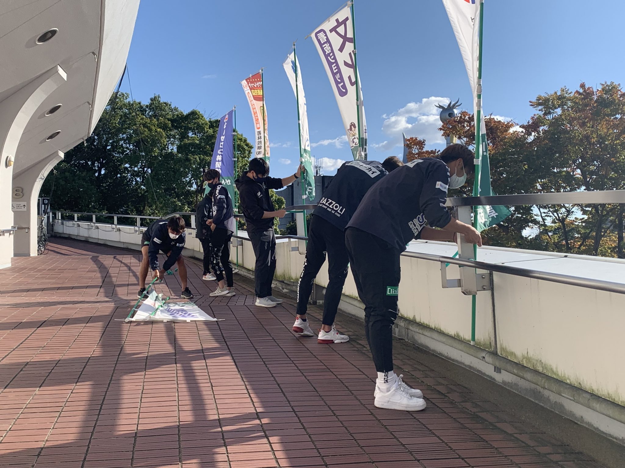 11月7日(日)カターレ富山とのホームゲームを行うにあたり、Jリーグ新人研修の一環(大西選手、町田選手は昨年実施できなかったため参加)として、11月5日(金)トップチーム選手6名とスタッフでスタジアムの会場設営を行いました。