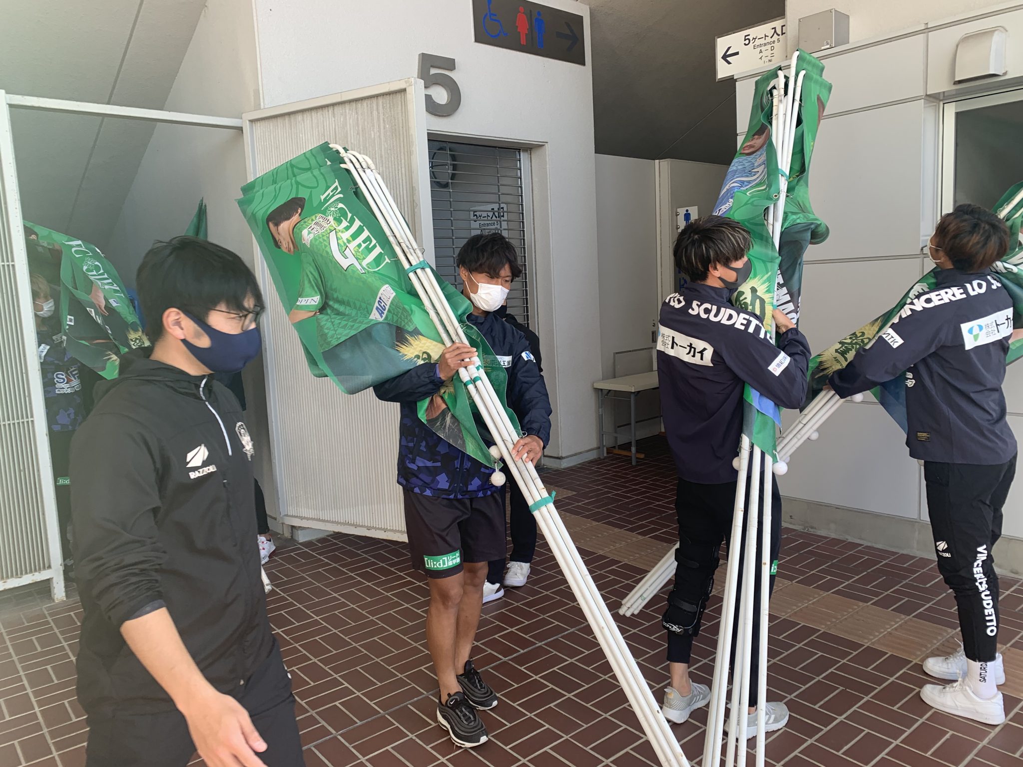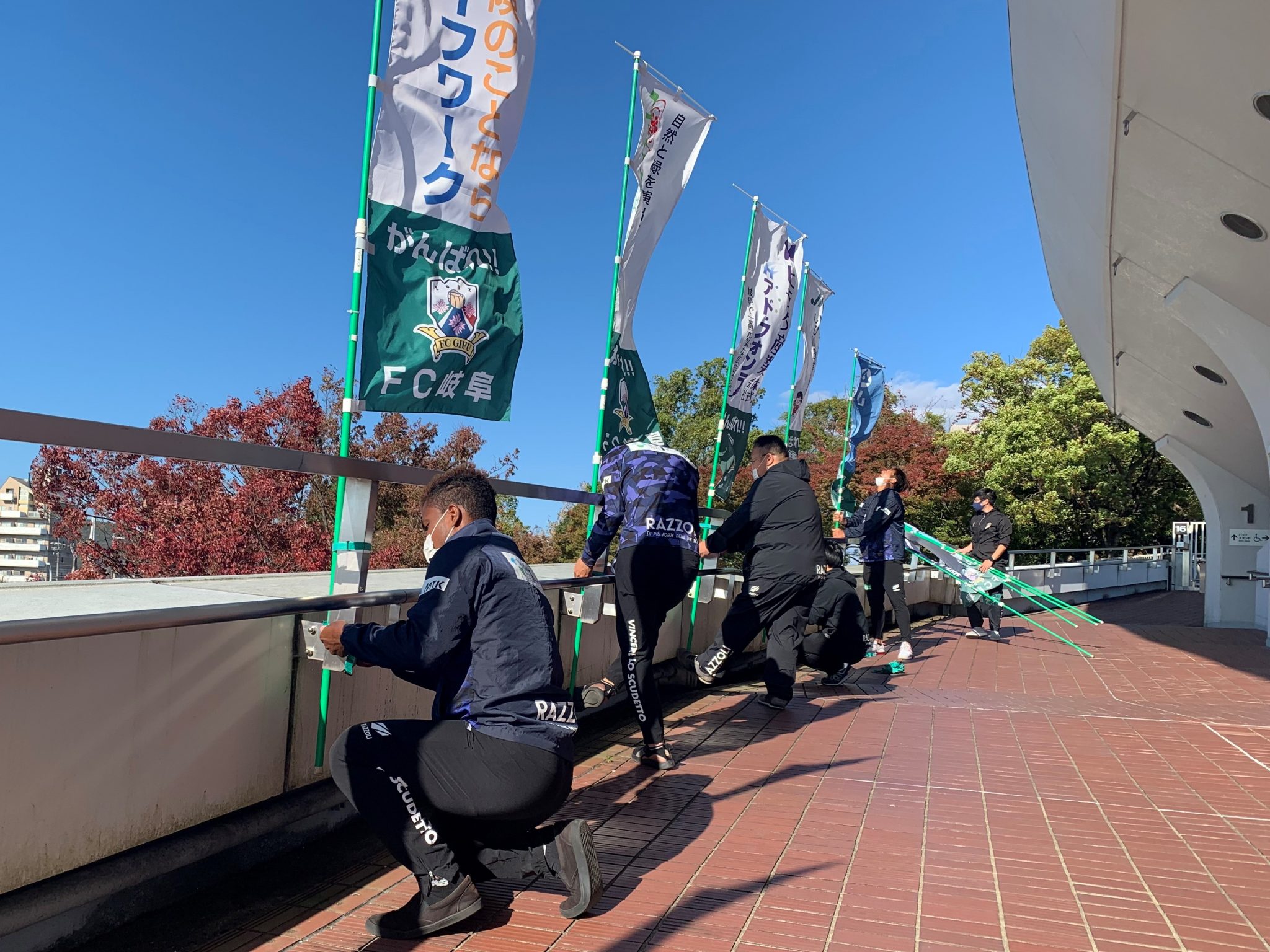 この日はスタジアム外の準備を中心にスポンサー様ののぼりやバナー、選手のぼりの設営を行いました。