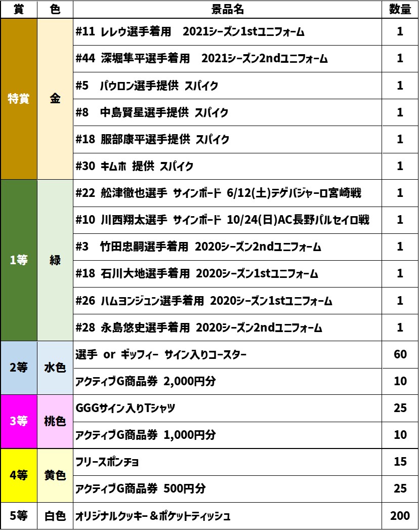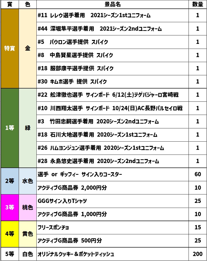 アクティブG施設内で発行された1,000円以上の当日レシートをご提示で、FC岐阜グッズや貴重な選手着用のユニフォームなどが当たる「がらがら抽選会」に参加できます。ハズレくじはありませんので、ぜひご参加ください。